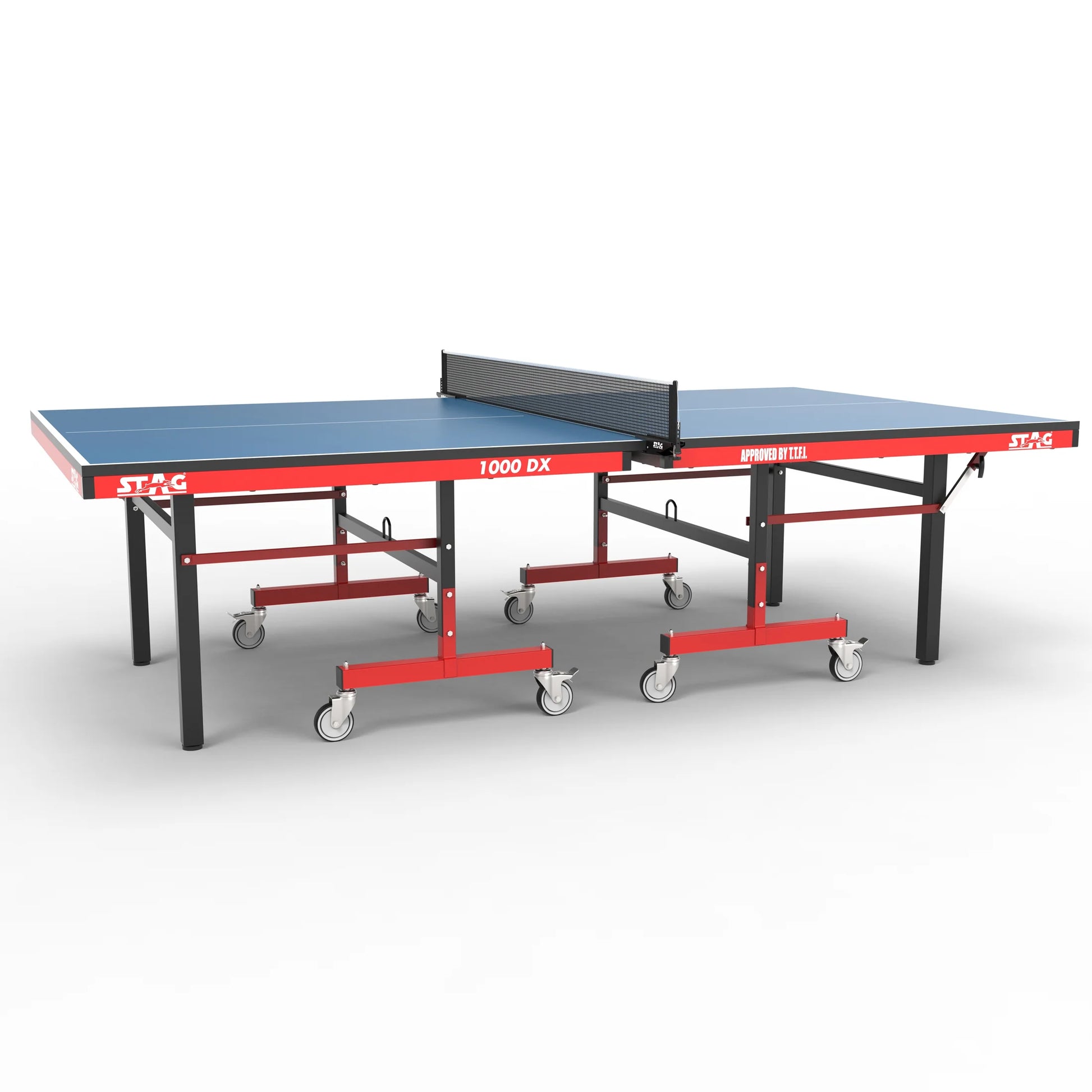 The Stag international table tennis table features a 25mm top to offer quality play and exceptional performance. The laminated surface is protected by the DuPont Polyurethane Anti Glare paint which offers stellar bounce and durability. This table has been used in many International Competitions including Asian Championships and Common Wealth Championships.